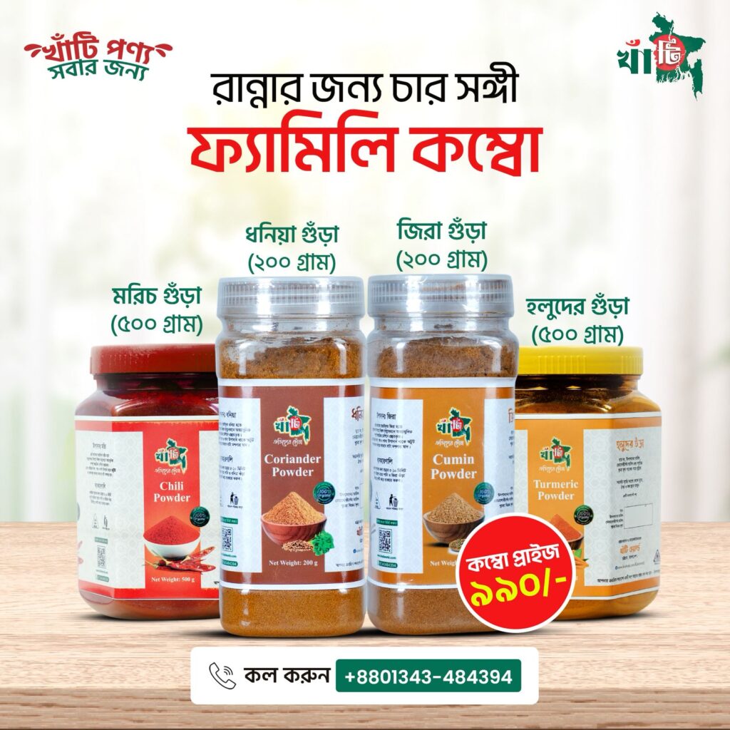 “খাঁটি” মাংস মসলা তৈরি হয়েছে ১৫ প্রকারের আসল দেশি মসলার বিশেষ অনুপাতে (Secret Ratio)।Each spice is sun-dried, hand-selected, and ground in a traditional wooden mill to preserve natural aroma and taste. রান্নায় ব্যবহার করলে মাংস হয় নরম, রসালো ও মুখে গলে যাওয়ার মতো স্বাদযুক্ত। Makes meat tender, juicy, and full of rich, authentic flavor. কোনো কৃত্রিম রঙ বা প্রিজারভেটিভ নেই — একদম বিশুদ্ধ ও প্রাকৃতিক। No artificial color or preservative — 100% natural and pure. Keywords: খাঁটি মাংস মসলা, Meat Masala Bangladesh, best meat spice mix, pure spice.
